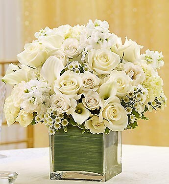 Elegant, hand-crafted wedding centerpiece arrangement of fresh white roses, white spray roses, white mini Calla lilies, white stock, white Monte casino and variegated pittosporum
