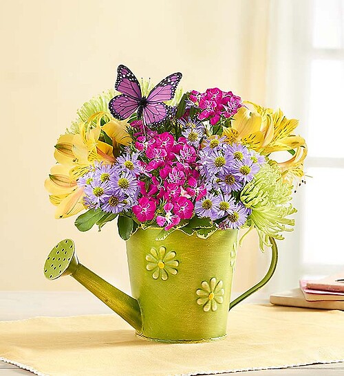EXCLUSIVE The unique beauty of our lush spring bouquet is almost impossible to contain! This lively gathering of blooms is accented by a lovely butterfly—which is a welcome sign of the season. Adding to the charm of our gift is the rustic daisy watering can in which it arrives. We can’t think of more delightful way to surprise someone you care about… and to watch their happiness grow!