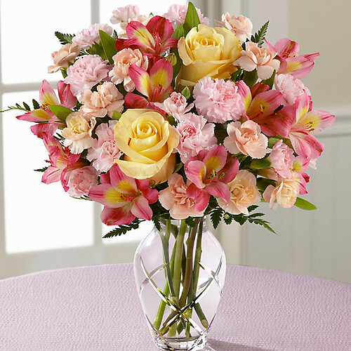 The Spring Garden® Bouquet blooms in soft and lovely seasonal color to make a glorious Mothers Day treat that will thrill mom on her big day. Soft yellow roses, pink spray roses and mini carnations and bright pink Peruvian Lilies are accented with lush greens to create a refreshing flower arrangement in a heavy, crystal clear glass vase sparkling with a contemporary cut glass design. Why limit this bouquet to Mothers Day? Its also perfect for birthdays, special anniversaries or to say Thank You!.